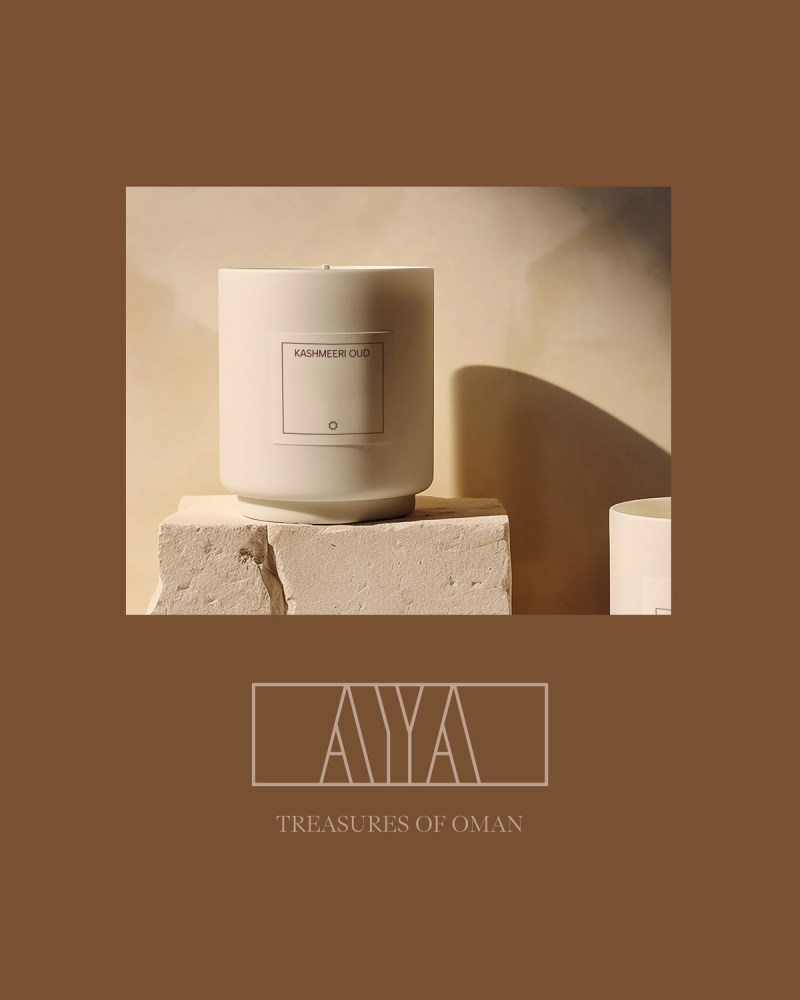 In the second half of 2024, we collaborated with Zainab Al-Mamari to develop the visual identity for her brand, AYA. With a background as a diplomat for Foreign Affairs in Oman, Zainab now lives in Germany and continues her role as a mediator, conveying the richness and diversity of Omani culture through AYA. Also a dedicated space in Ingolstadt is planned to offer an experience of Omani treasures. The logo reflects columns, tiles, and space for the Omani Experience, while the star element—derived from the „A“ in the wordmark—symbolizes guidance, light, and heritage. The color palette blends earthy tones, deep pomegranate red, and lavender as a contrasting hue.