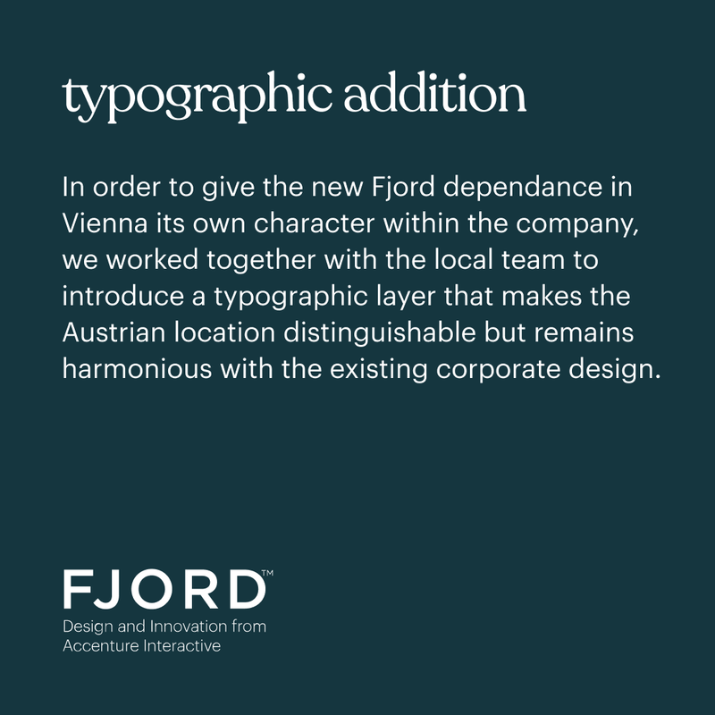 In order to give the new Fjord dependance in Vienna its own character within the company, we worked together with the local team to introduce a typographic layer that makes the Austrian location distinguishable but remains harmonious with the existing corporate design.